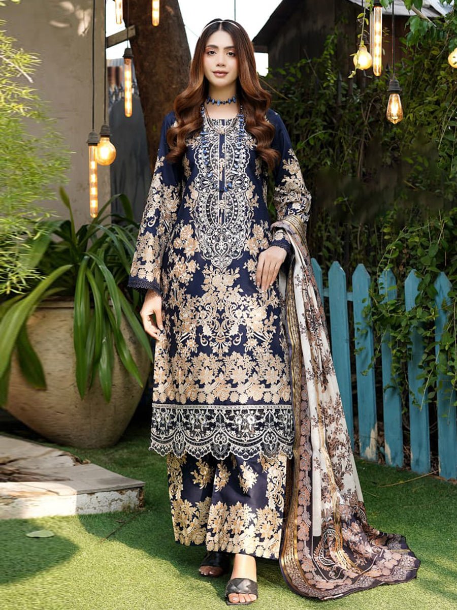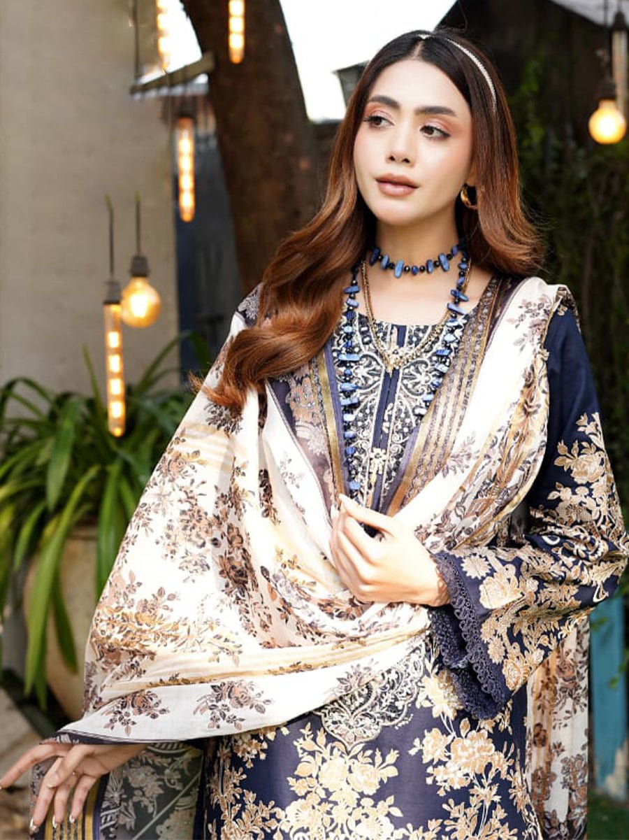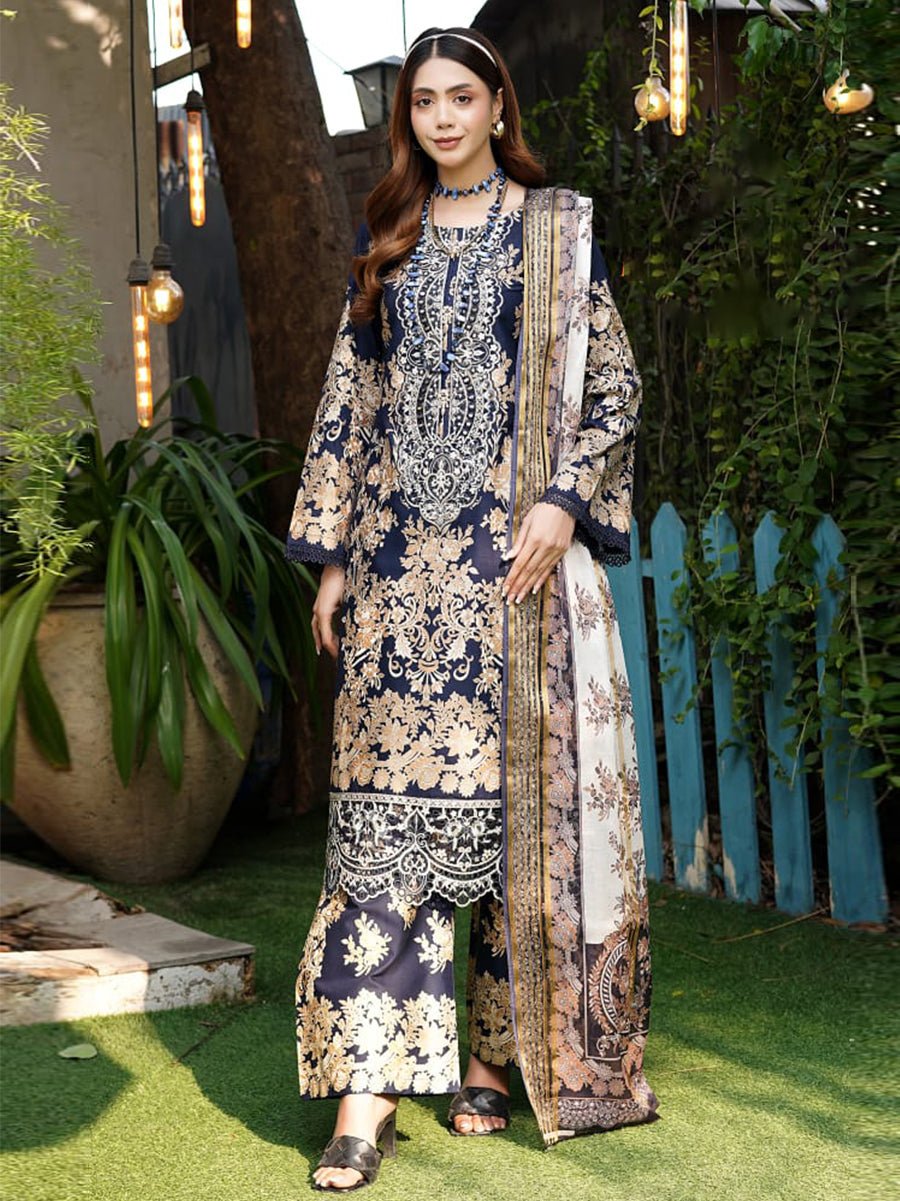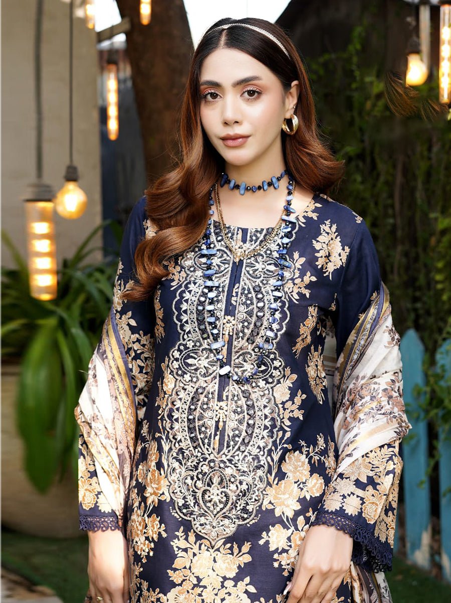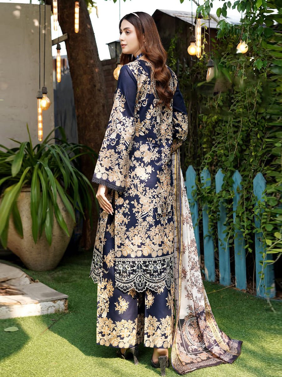 Step into the allure of Mahjabeen (مہجبین), where elegance meets timeless charm. This exquisite navy blue 3-piece cotton suit is crafted for those who appreciate sophistication in its purest form. The breathable, soft cotton shirt ensures lasting comfort, adorned with refined details that enhance its regal appeal. Paired with a plain cotton trouser, it offers a poised and graceful silhouette, perfect for both daytime gatherings and evening soirées.