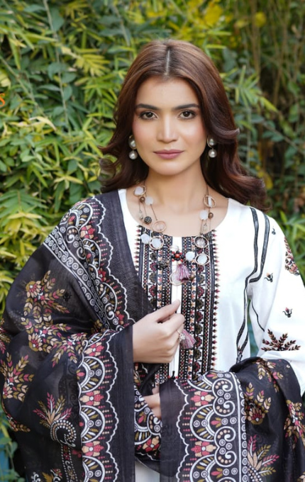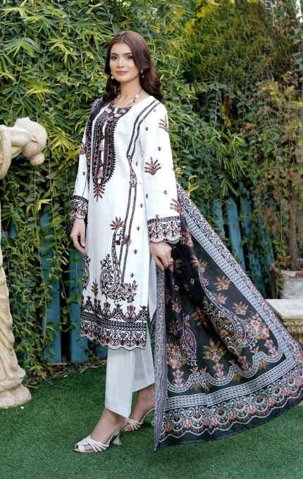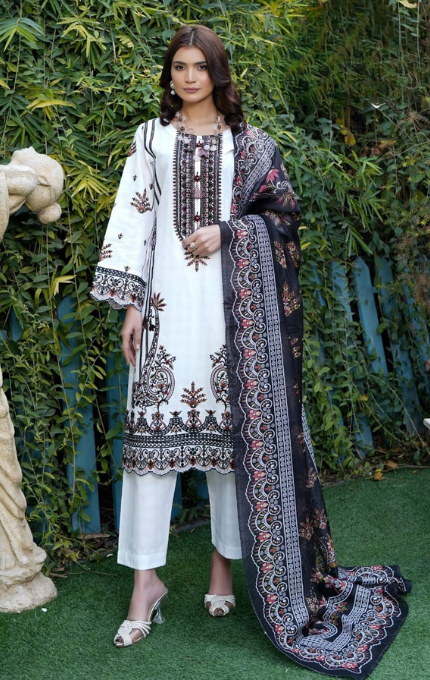 Soft white base par fine embroidery aur black printed lawn dupatta ke sath yeh 3PC stitched suit hai ek timeless classic. Front panel par intricate threadwork aur contrast colors ka tasteful touch isay banata hai everyday elegance ka perfect example.
