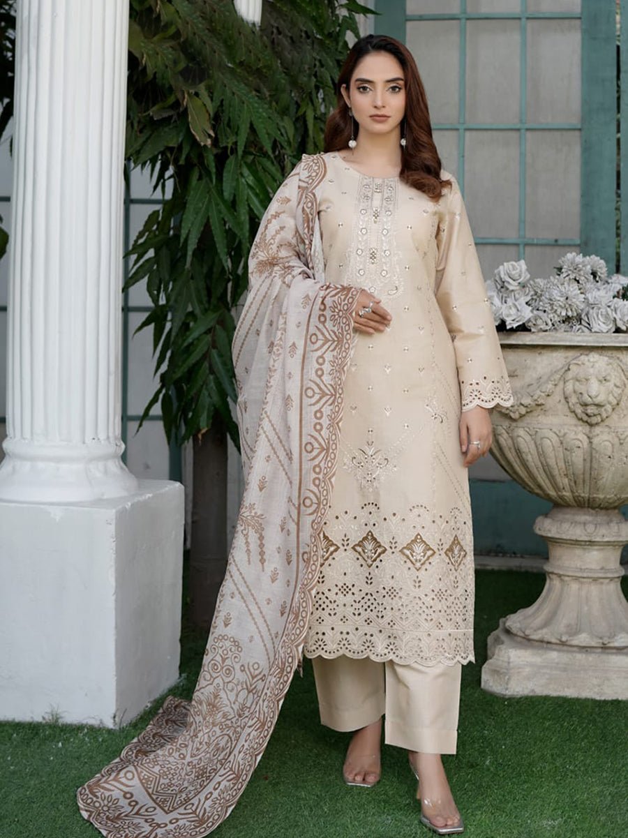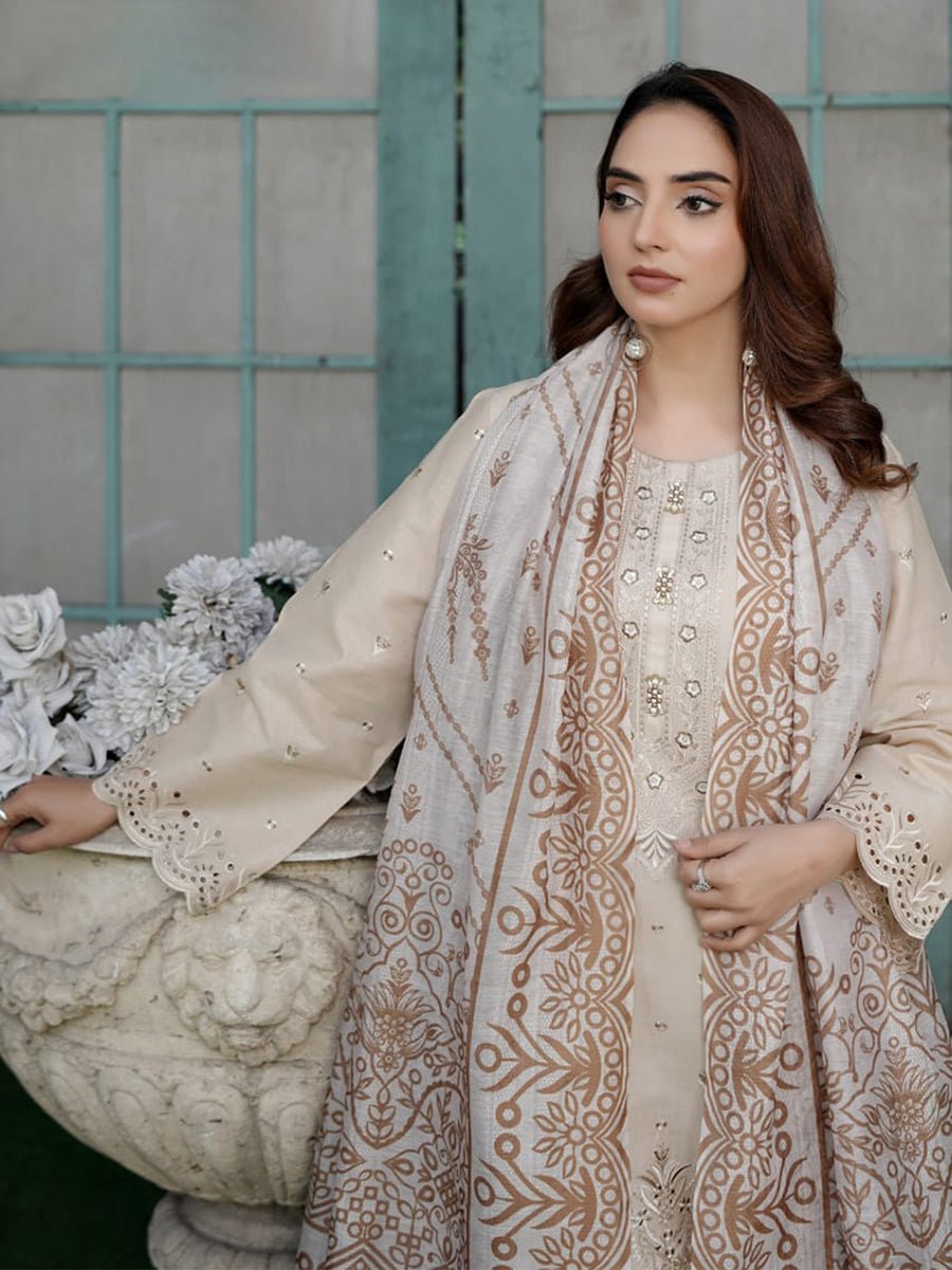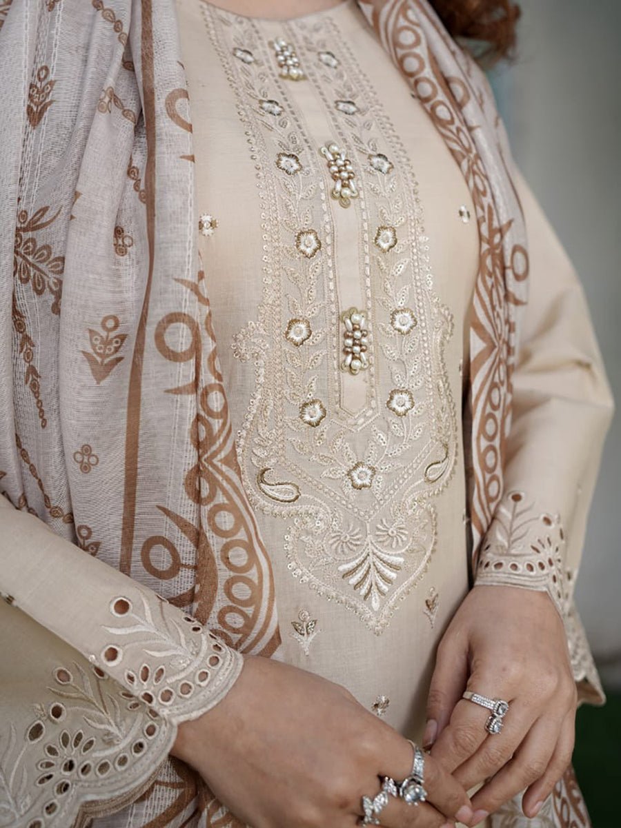 Naqsh-e-Zar (نقشِ زر) in a delicate Skin tone embodies timeless elegance and understated beauty. This 3-piece cotton suit is crafted with both comfort and style in mind, featuring a soft cotton shirt that ensures a comfortable and breathable fit throughout the day. The plain cotton trouser adds a polished touch, creating a clean, sophisticated silhouette.