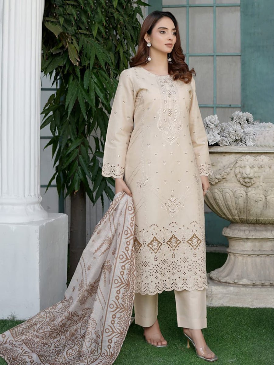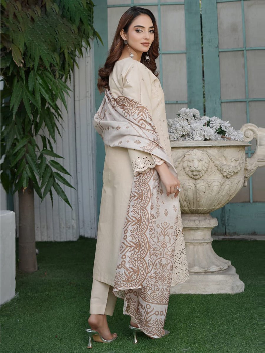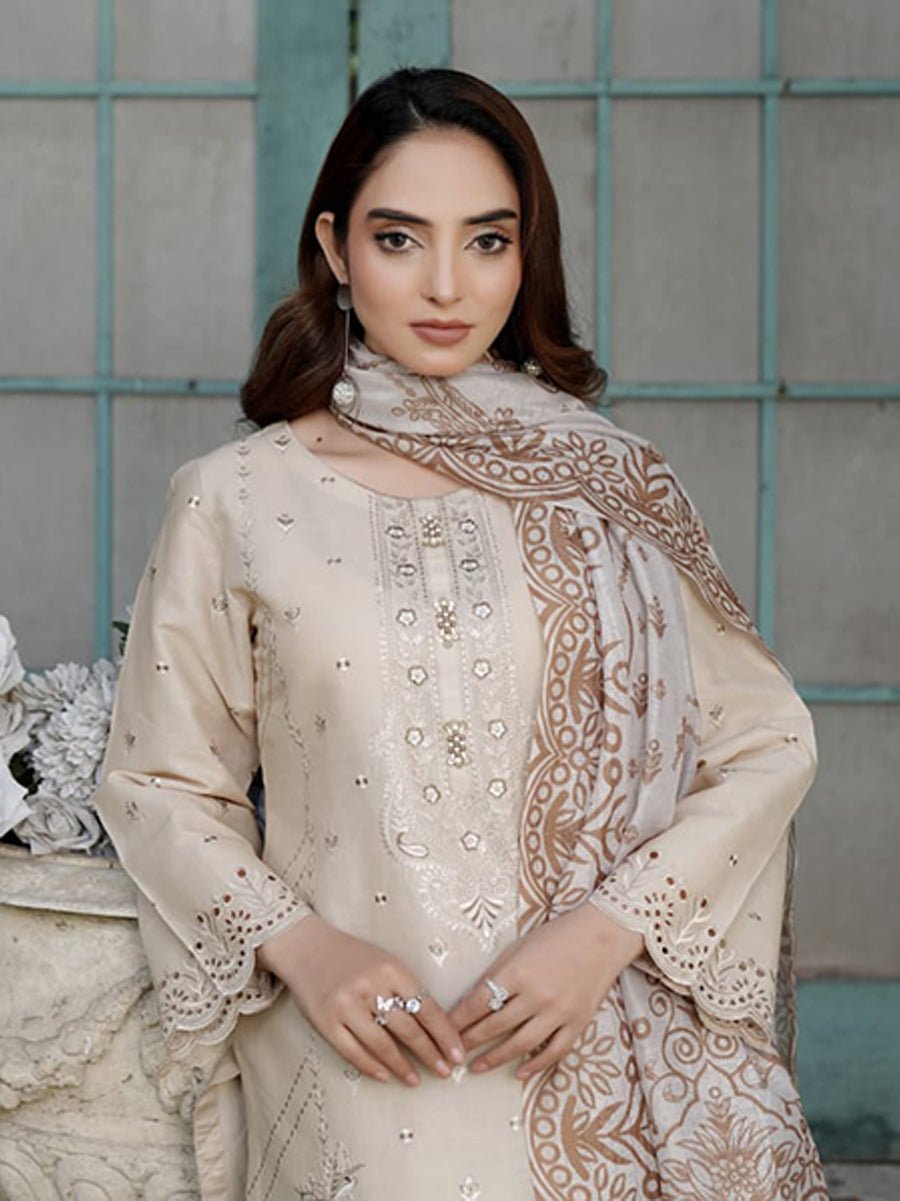 Naqsh-e-Zar (نقشِ زر) in a delicate Skin tone embodies timeless elegance and understated beauty. This 3-piece cotton suit is crafted with both comfort and style in mind, featuring a soft cotton shirt that ensures a comfortable and breathable fit throughout the day. The plain cotton trouser adds a polished touch, creating a clean, sophisticated silhouette.