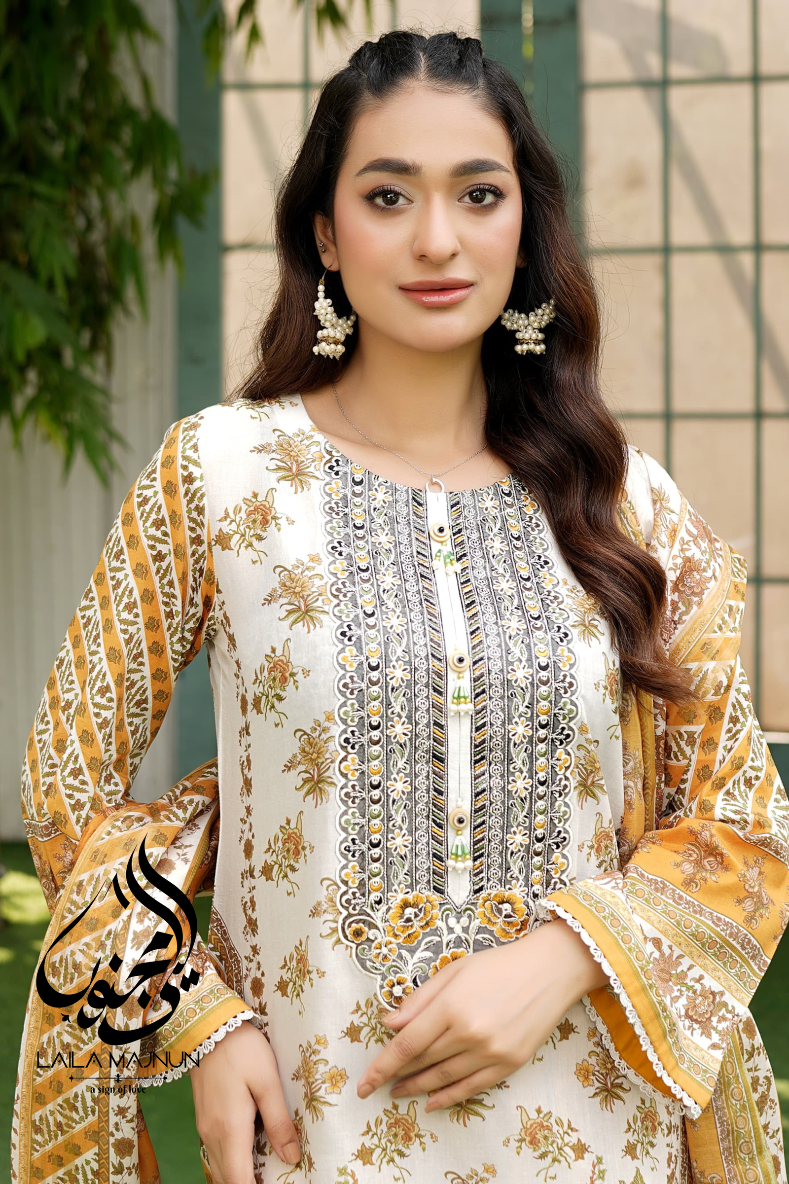 A warm beige shirt adorned with mustard floral prints and delicate embroidery. This look is completed with a mustard trouser and a printed dupatta with traditional motifs for a vibrant finish.