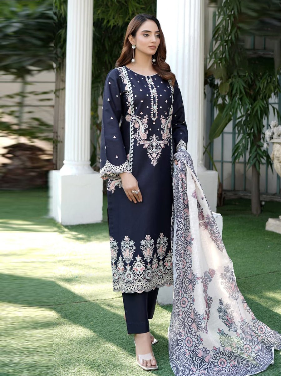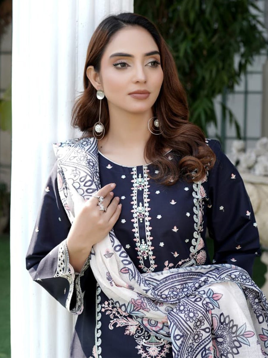 Step into the regal charm of Noor-e-Naz (نورِ ناز), a masterpiece of grace and elegance. This exquisite navi blue 3-piece cotton suit embodies sophistication with its breathable, soft fabric that offers unmatched comfort. The finely crafted details on the cotton shirt enhance its timeless appeal, while the plain cotton trouser ensures a sleek and polished look, perfect for both casual and formal gatherings.