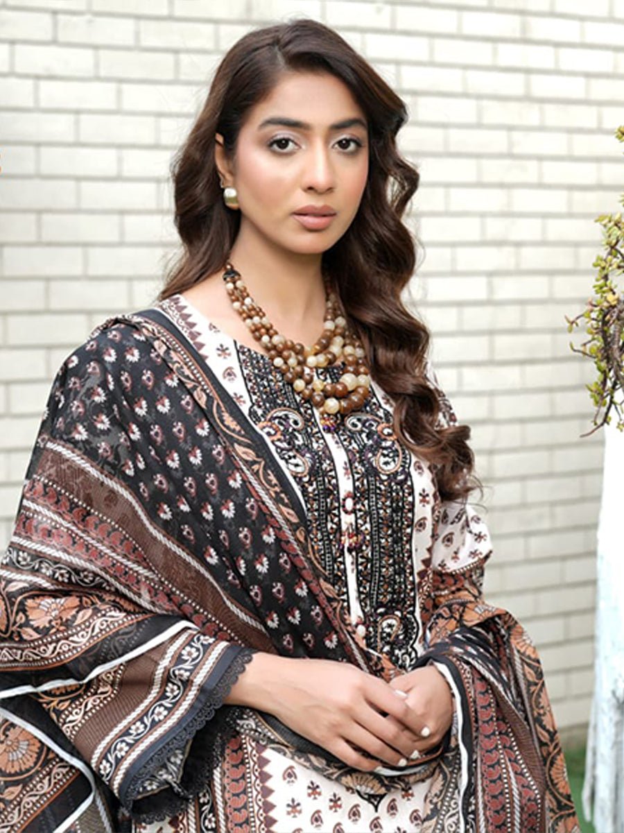 The look is completed with a printed Khadi net dupatta, showcasing intricate patterns that enhance its refined charm. The lightweight, airy fabric drapes effort Zar Gul (زر گل) the perfect choice for both casual outings and more formal occasions.