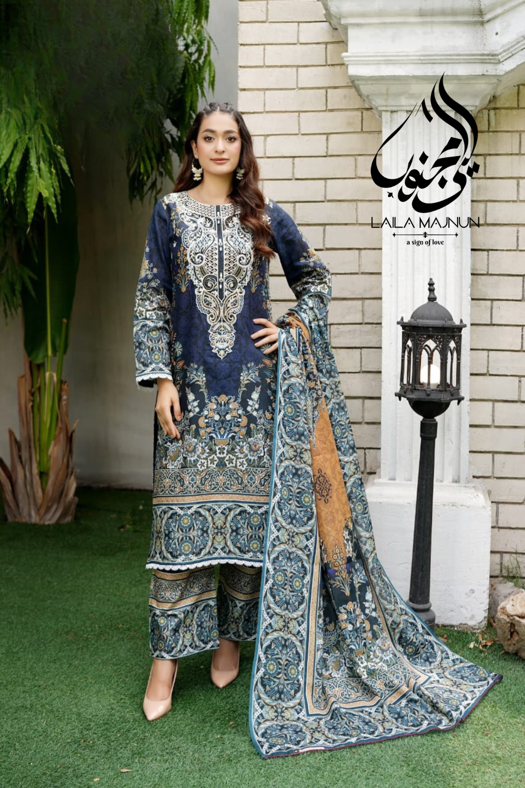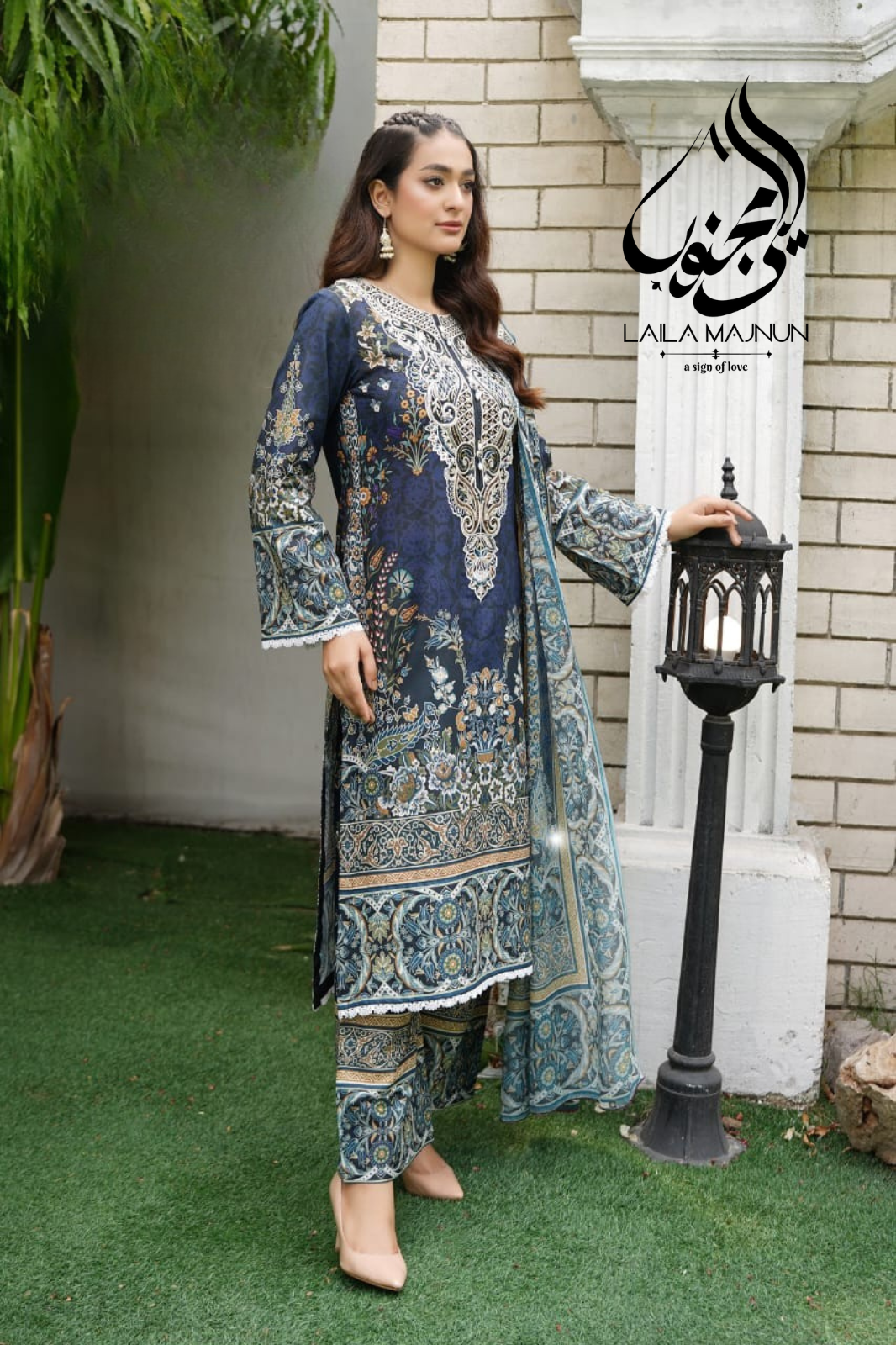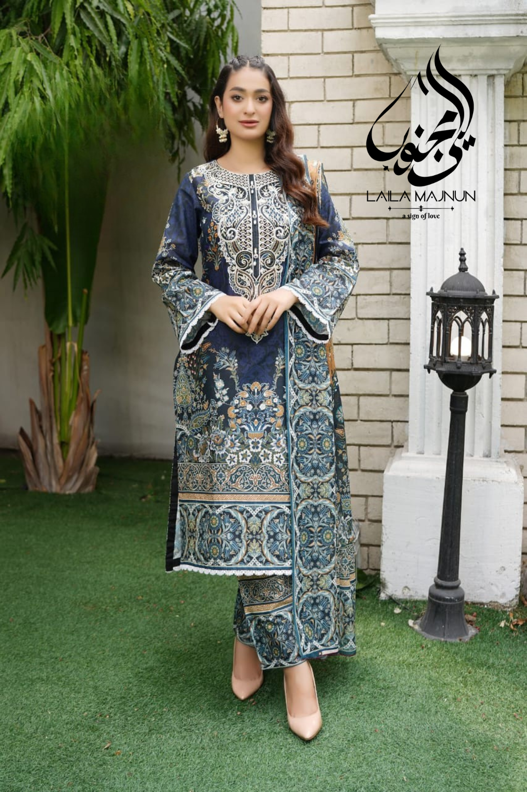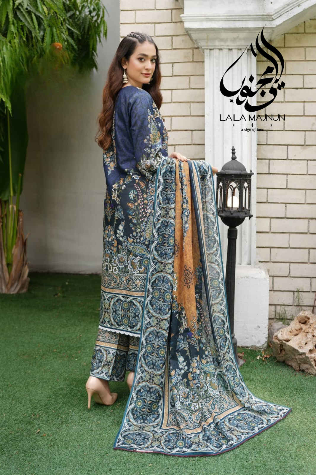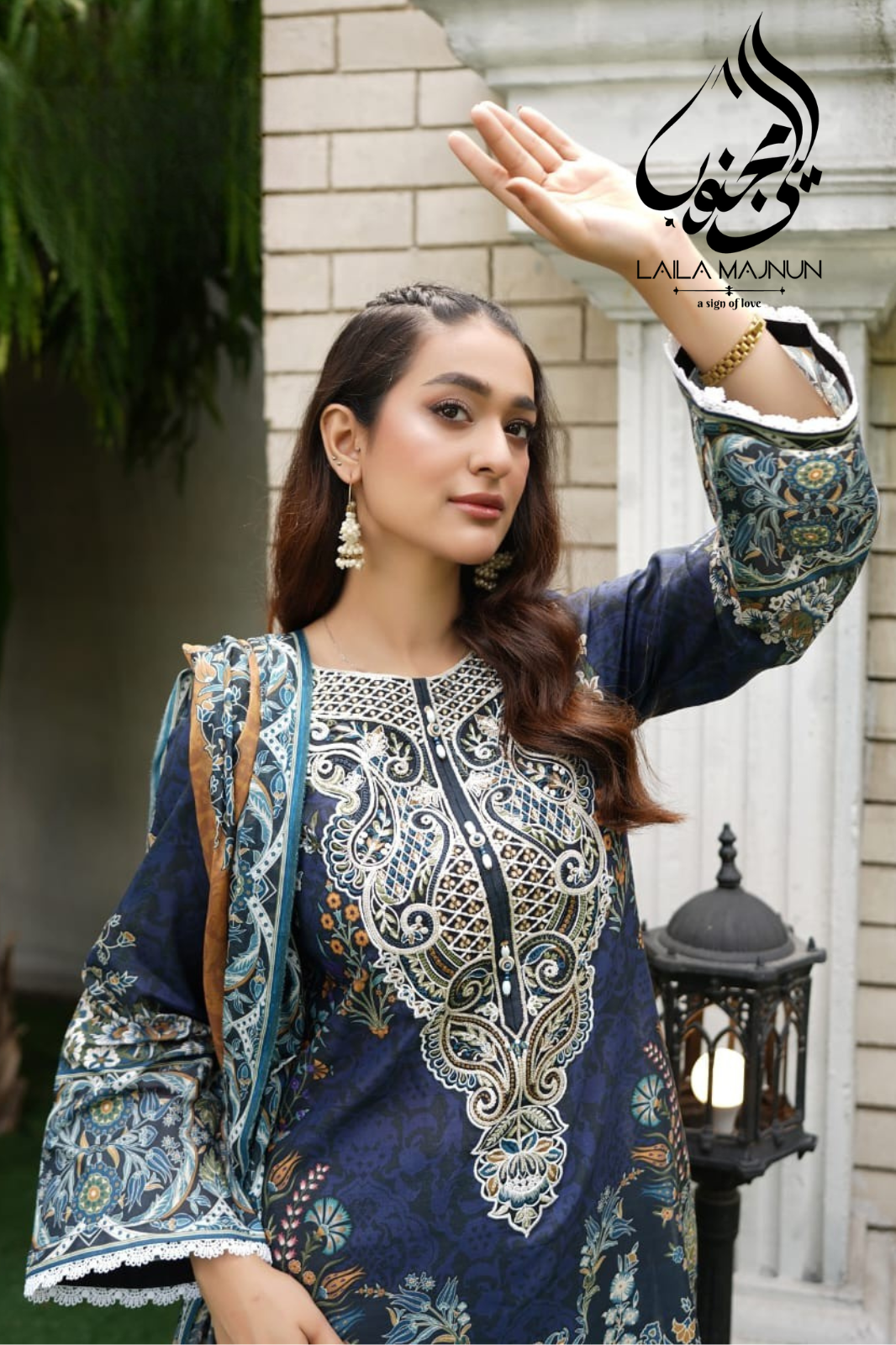 Bring elegance to your summer wardrobe with Zeenat-e-Bahar, a beautiful outfit in deep navy and teal shades. The shirt has lovely floral prints and detailed embroidery on the front and sleeves. It comes with a stylish printed plazo and a light, airy chiffon dupatta with a traditional print. Perfect for casual outings or semi-formal events, this outfit blends comfort with a graceful style.