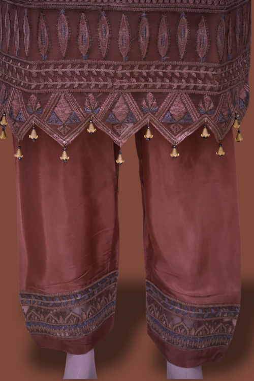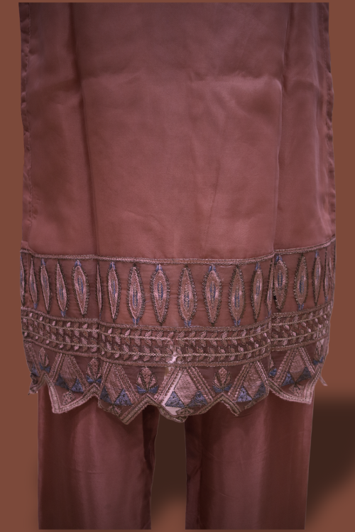 Unveil the art of timeless grace with Zehra-e-Gulnaar — a regal copper-toned ensemble from Laila Majnun’s luxury festive collection. The shirt features exquisite embroidery in antique gold and silver tones, accented with delicate handwork, mirror details, and bead embellishments. The straight-cut pants carry matching embroidery for a cohesive look, while the sheer organza dupatta adds softness with scattered sequins and subtle lace finishing.